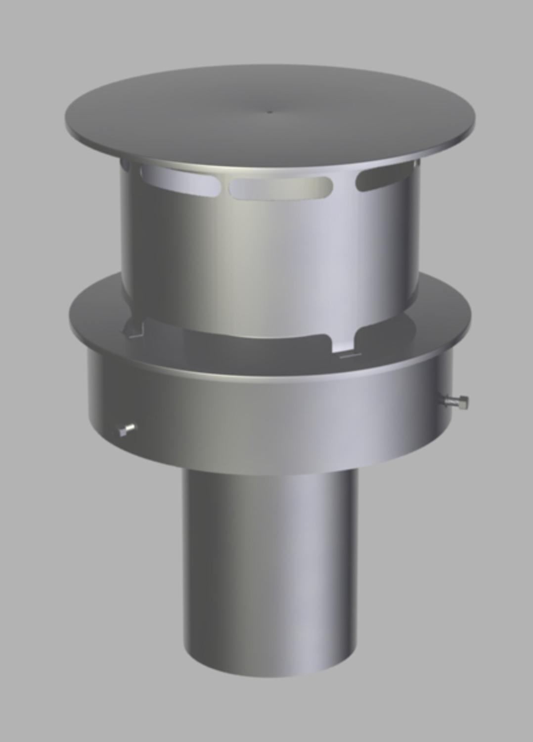 The roof outlet of the Metaloterm UK system forms the upper end of a concentric flue gas duct at the roof duct. This element is designed for the safe discharge of flue gases and the supply of combustion air for closed combustion appliances and is installed on a pitched or flat roof. The outlet is made of high-quality 316 stainless steel with a wall thickness of 0.6 mm and features an integrated elastomer seal for a gas-tight and watertight connection. This roof duct ensures a proper and durable finish of the flue gas path above the roof level.