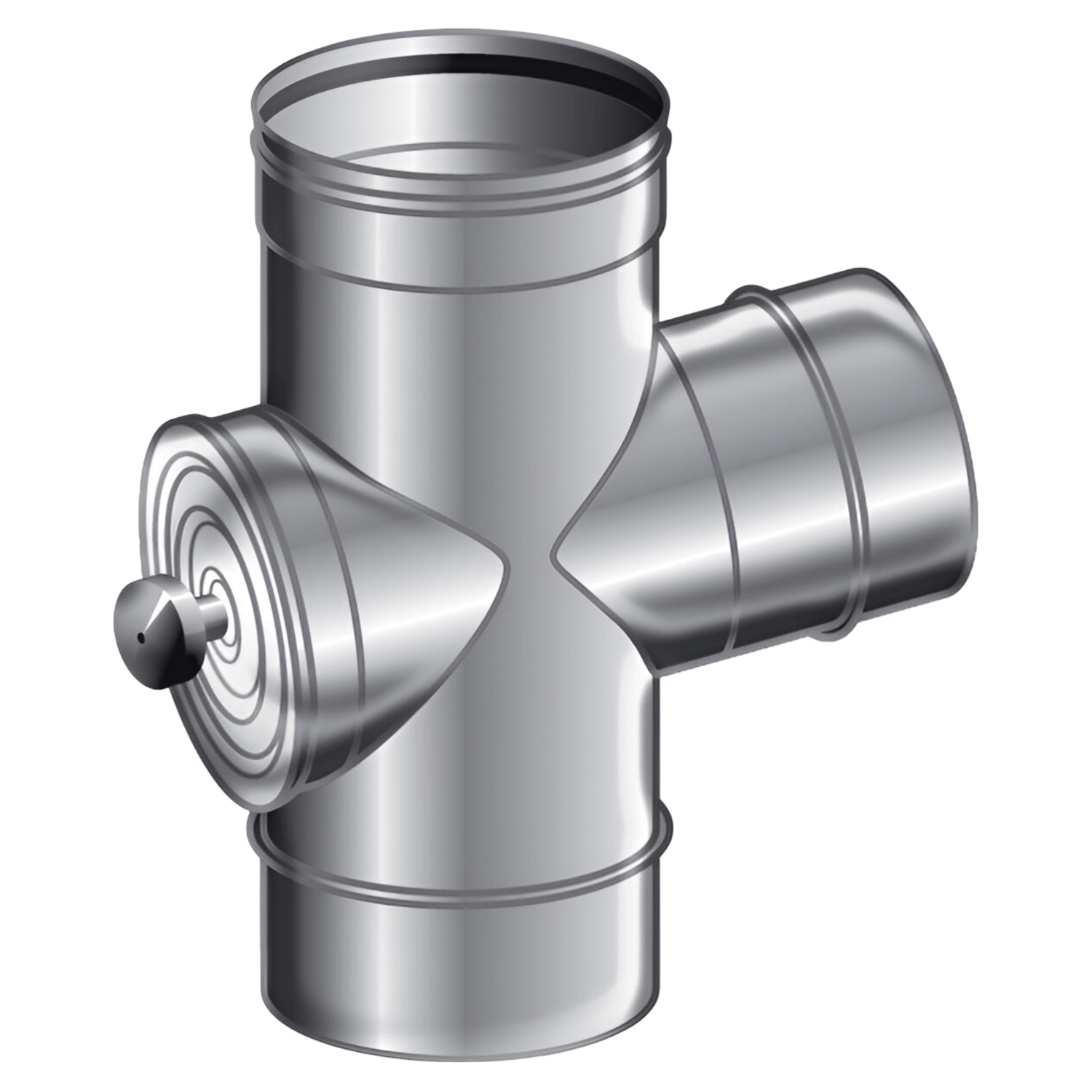 The LD Flue stainless steel 90° T-piece with a cleaning hatch, seal, and male connection combines a functional flue gas branch with easy maintenance. Thanks to the integrated cleaning hatch, the flue is easily accessible for inspection and cleaning without disassembling the system.
