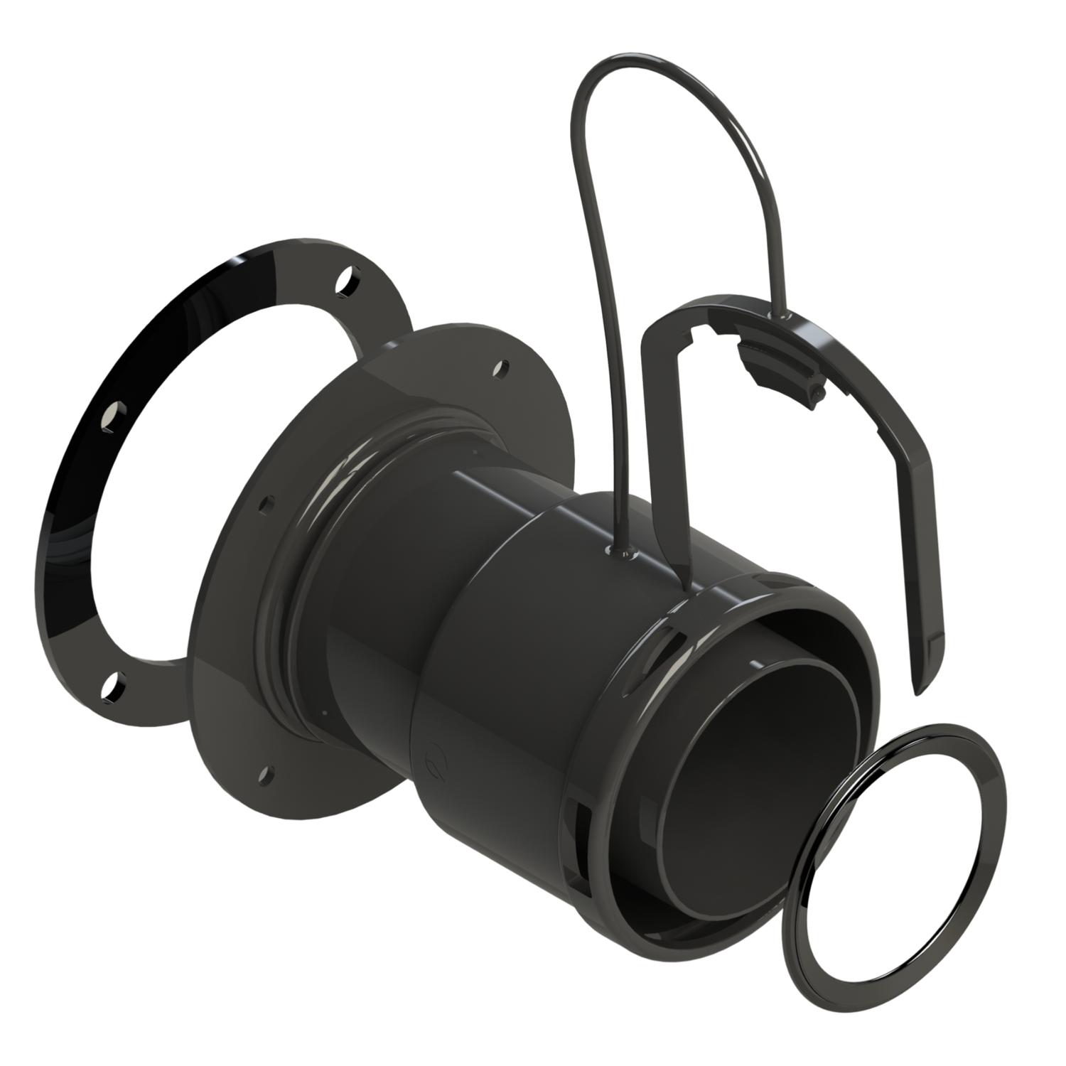 Raccord à bride résistant aux UV (en haut). Ce raccord permet de fixer le flexible CX à une plaque plane. Il est fourni avec un joint EPDM (pour le flexible) et un joint néoprène pour l'étanchéité.